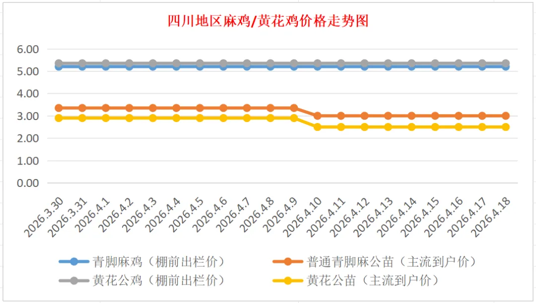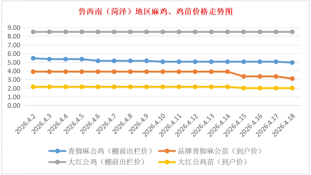 品牌青脚麻公苗(多品种快大型):价格稳定,到户价4.30元/羽,稳。