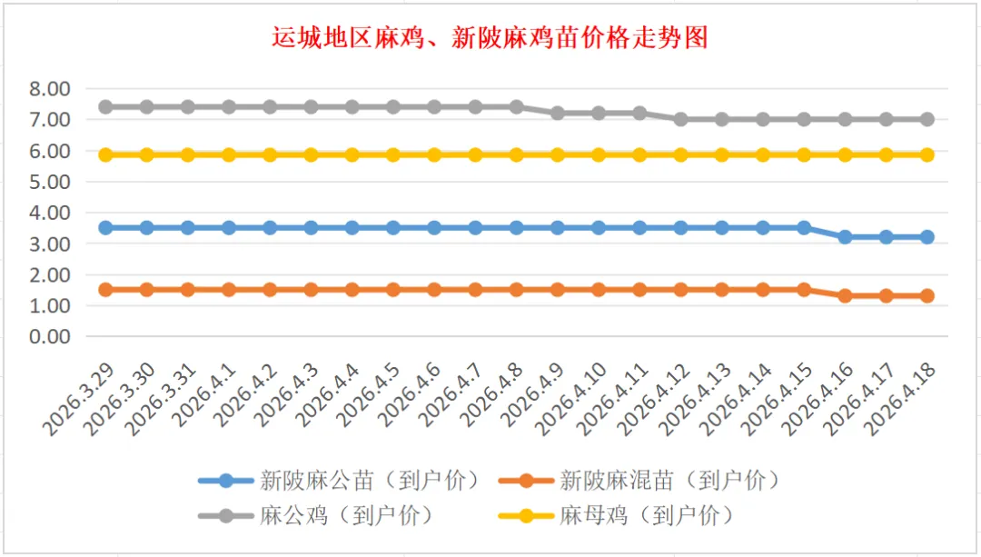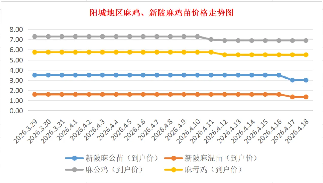 普通新陂麻:价格稳定,到户价公苗4.00元/羽,稳。