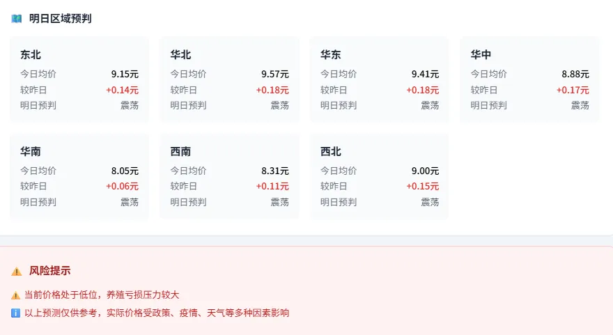 🔗 产销价差分析:猪肉(16.39) - 生猪(8.99) = 7.40元(价差率82.3%)。价差率较高,屠宰利润丰厚,但终端消费承压,需警惕价格回调风险。