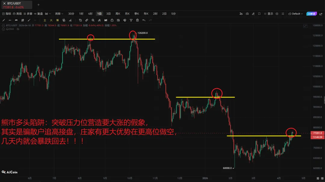 别再对着 K 线喊 “牛市来了” 了!当你看到价格突破压力位、K 线拉出大阳线,以为终于要开启新一轮上涨时,庄家的镰刀已经架在了你的脖子上 ——熊市周期里,没有真突破,所有向上的 “假突破”,全是骗散户追高接盘的诱多陷阱,而真正的机会,永远是在突破的那一刻,反手做空。