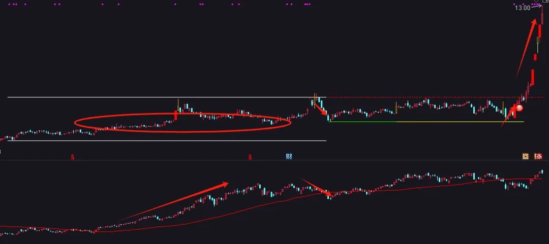 这种走势出现以后,突破红色虚线,涨停后回踩企稳,刚好是二次加仓机会,基本上这样的票是最强势的。