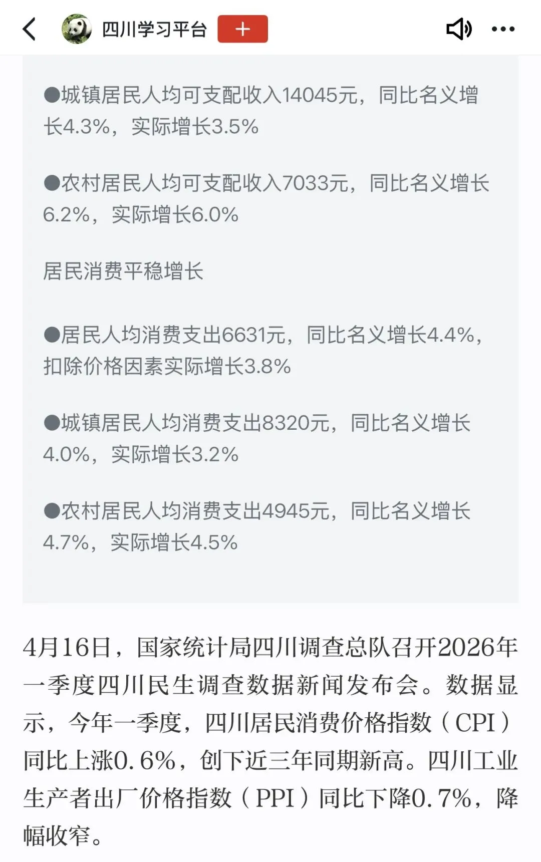 根据2026年一季度的数据,四川CPI同比上涨0.6%,创下近三年同期新高,尤其是核心CPI(扣除食品和能源)连续13个月上涨。