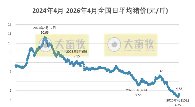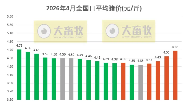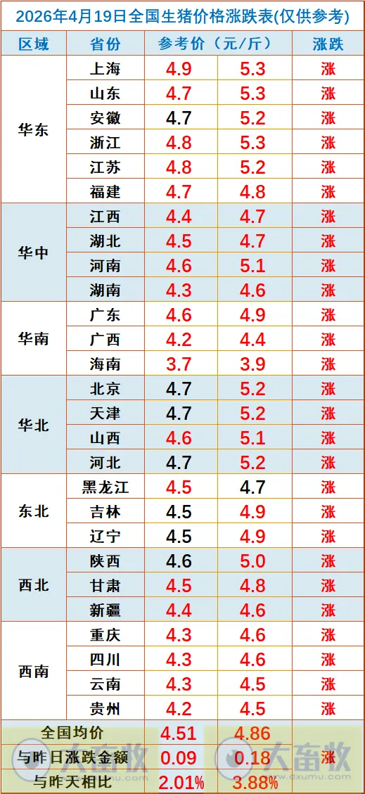 大畜牧小编根据我国27省的猪价数据,计算出2026年4月19日全国平均猪价为每斤4.68元,比昨天上涨0.13元,涨幅为2.95%,继续大幅上涨,连续4天上涨,累计上涨0.33元,为近18天最高价;