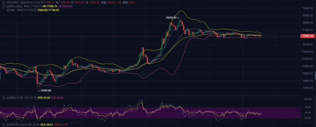 只要没跌破,多头还是大哥,别轻易空。上方先看前高 78330,如果冲不上去,小级别会有一波回踩;但要是真能强势突破78330,那就别犹豫,往上等 79300、81500、83000 这几个位置找空单机会。