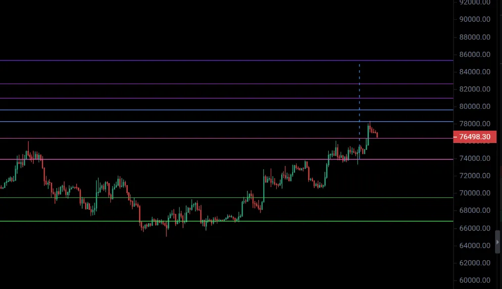 这两天BTC明显有点转强的意思,之前也提过,外部不确定性一缓下来,行情大概率会往上修复。昨天最高已经冲到7.8万附近,短期情绪是被带起来了,但真正的大压力还是在8.5万那一带。