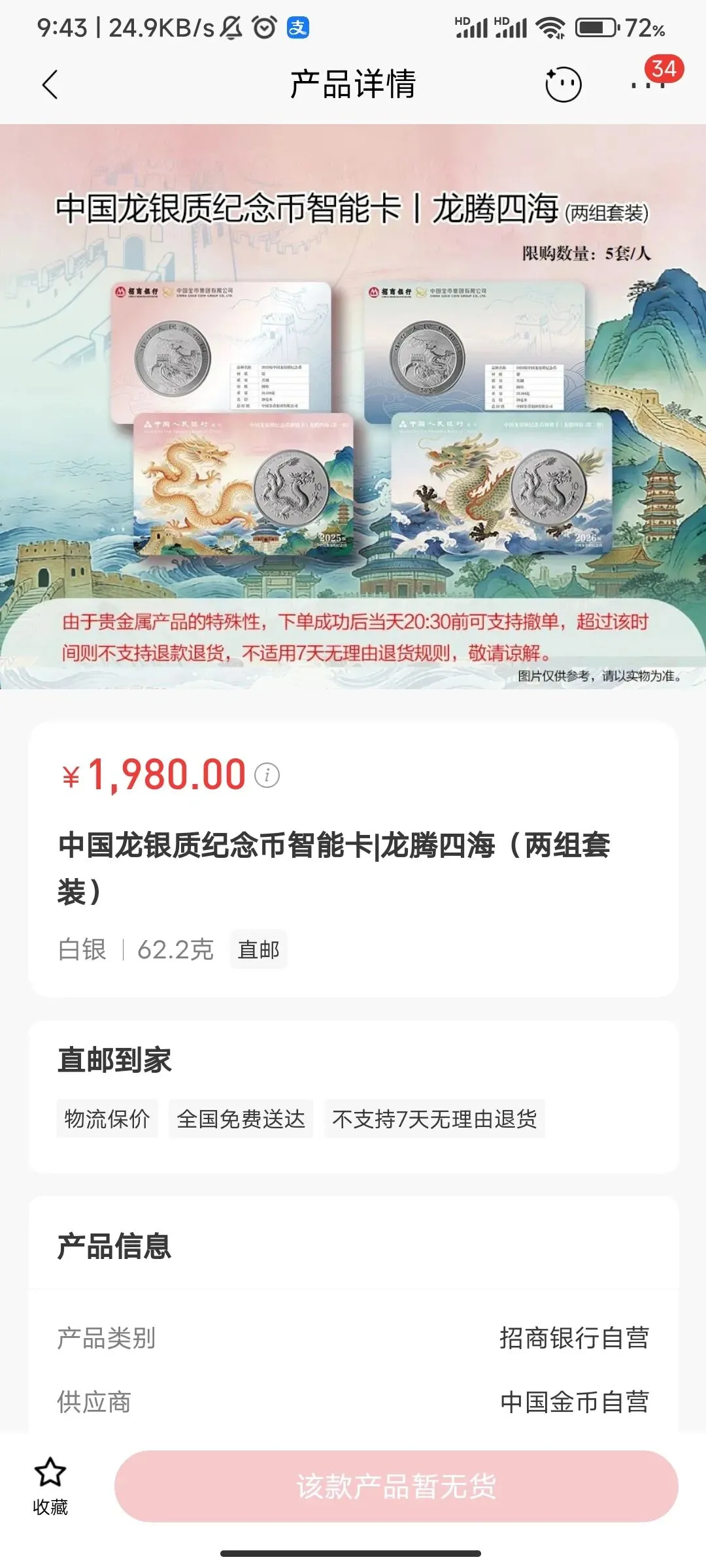 4.17上午9点半,招商银行APP开卖,2万套,售价1980