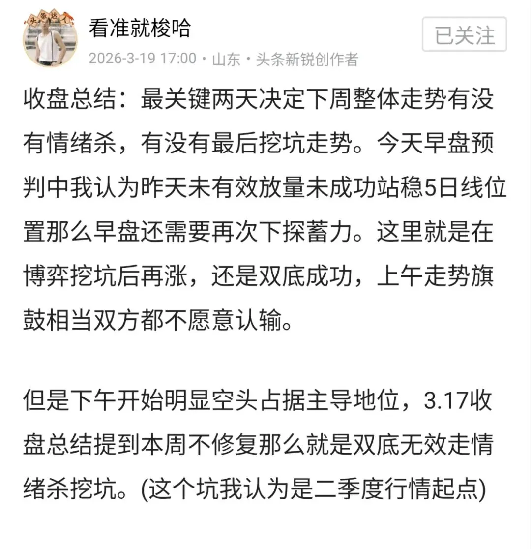 周末行情回顾:3.17文章讲到当周修复不了就是意味着双底无效,开始挖坑走势,这个坑就是二季度行情起点。(你是在收集筹码还是被迫割肉出局)