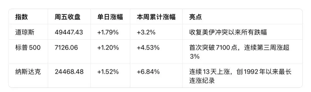 · 美股:受伊朗开放霍尔木兹海峡的重大消息刺激,纳指实现 13连涨(1992年1月以来最长连涨纪录),标普500连续第三周收涨逾 3%。
