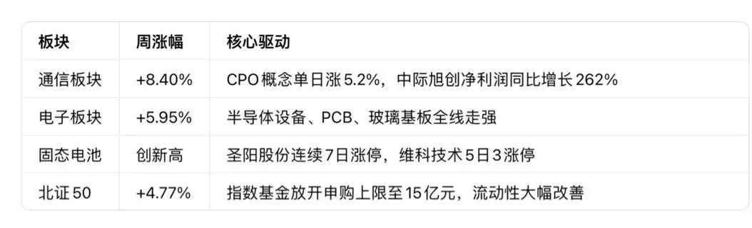· A股:极致结构性分化,成长风格显著占优。创业板指单周大涨 6.7%,连续每日刷新近11年纪录。AI算力产业链成为贯穿全周的唯一主线,光模块、半导体等科技赛道资金高度抱团。