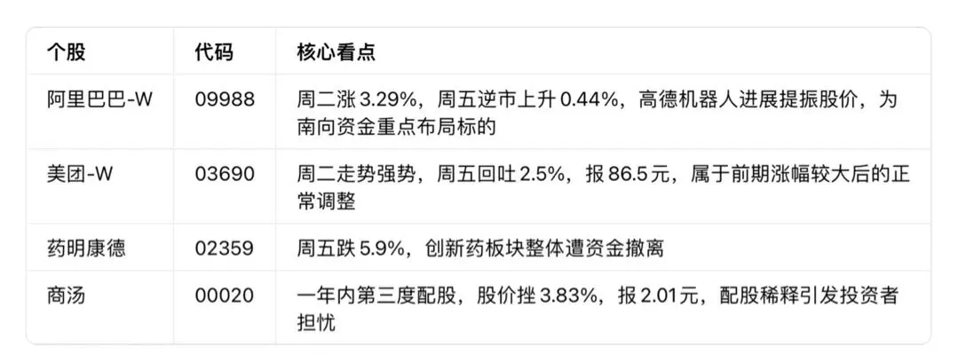 · 金融板块:周五普跌,友邦跌3.1%、中国平安跌3.3%,前期累积升幅较大。