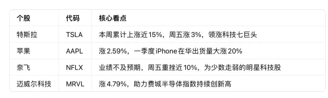 · 科技七巨头全线走强:特斯拉本周累涨近 15%,苹果涨2.59%,英伟达、谷歌、Meta涨超1%。