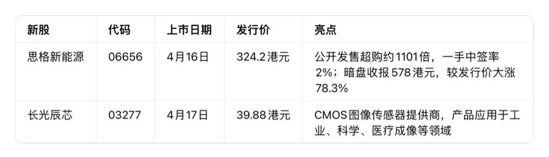 此外,华勤技术(03296)于4月15日起招股,募资逾45亿港元,摩根大通、瑞银等18家基石参投,预计4月23日上市。