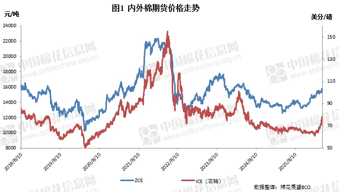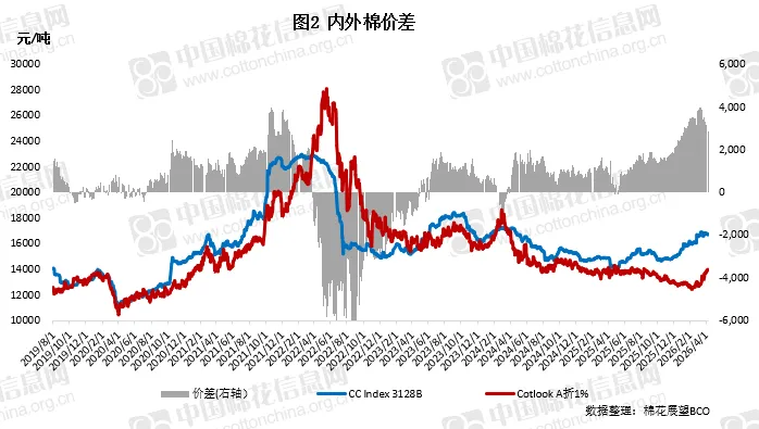 本周郑棉主力合约先抑后扬,周初快速下探后窄幅整理,周四多头发力推动期价直线拉升,最高触及15975元/吨,随后高位震荡。现货价格随期价波动,纺企对皮棉原料刚需补库为主。棉纱期货在21500元/吨至22200元/吨之间震荡走高,现货价格保持稳定。棉纱期货周内结算价22150元/吨,较上周上涨190元/吨。周内中国纱线价格指数保持不变,进口棉纱价格指数小幅上涨,均价较上周分别持平和上涨27元/吨,国内外棉纱价差从175元/吨收窄至148元/吨。