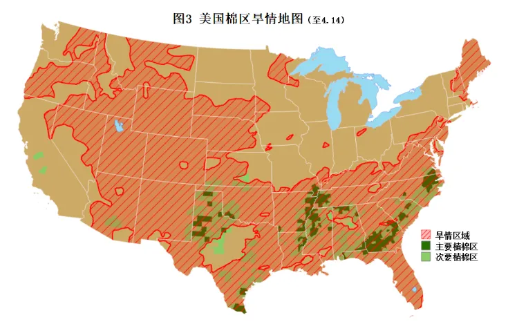近期美国棉区旱情再度转差,得州旱情因局地降雨再度小幅好转。据最新旱情监测数据来看,至4月14日,全美约97%的植棉区受旱情困扰,较前一周(95%)增加2个百分点;其中得州约96%的植棉区受旱情困扰,较前一周(97%)减少1个百分点。全美新棉播种工作仍在陆续启动中,各棉区旱情未见好转,需持续关注后续天气及旱情情况对新年度植棉及产量预期的影响。