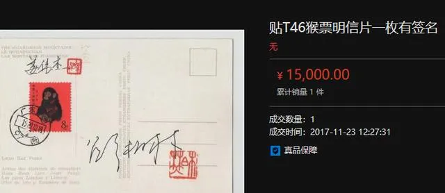 这个红底黑字的截图,是一封贴了T46猴票的明信片或者实寄封,上头还有签名,成交价直接写着15000,时间落在2017年11月,旁边还标着真品保障,那几年行情热,带点故事的东西就容易被追着要,签名,实寄,邮戳,都是加分项,奶奶以前不懂这些,她就认一个理,信是走过路的,纸是见过人的,她说这种东西拿在手里不空,哪怕以后不涨也不亏心,现在想想,这句话放到今天更像提醒,热的时候别把“故事”当万能钥匙,冷的时候也别把“故事”一脚踢开。