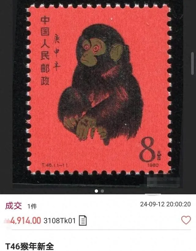 图中这枚就是最常见的那张T46庚申年猴票单枚,红底子很正,黑猴子抱着手坐着,边齿一圈一圈像小锯口,右下角是8分,底下成交4914,日期写着24年9月12日晚上,这个数一出来,很多人心里就咯噔一下,因为它把所谓的“底”往下又挪了一截,以前大家聊天总爱说一句,猴票不怕,跌也跌不到哪去,可真到了拍卖场上,新低价一打开,大家才知道底是会换地方的,我有个朋友专收评级票,他看完就叹气,说评级在热的时候像盔甲,冷的时候像枷锁,分数不够嫌你不够硬,分数太高又嫌你太贵,夹在中间的最难受。