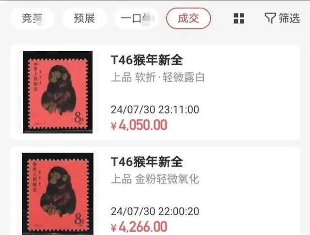 这个页面一眼就能看出来是平台的成交记录,两条同名的T46猴年新全,标着上品,软折,轻微露白,还有一条写金粉轻微氧化,成交价4050和4266,时间卡在2024年7月30日的晚上,短短几十分钟两口价,像是同一拨人盯着看又悄悄放手,现在的猴票更像在跟品相较劲,一点点折,一点点白,一点点氧化,都会把价压下去,爷爷要是还在,他估计会说你们这叫挑刺,他那年代买东西先问能不能用,我们这年代收东西先问能不能过眼,不过话又说回来,市场就是这样,以前大家看“猴票”三个字就热,现在更多人先看细节再看标题。