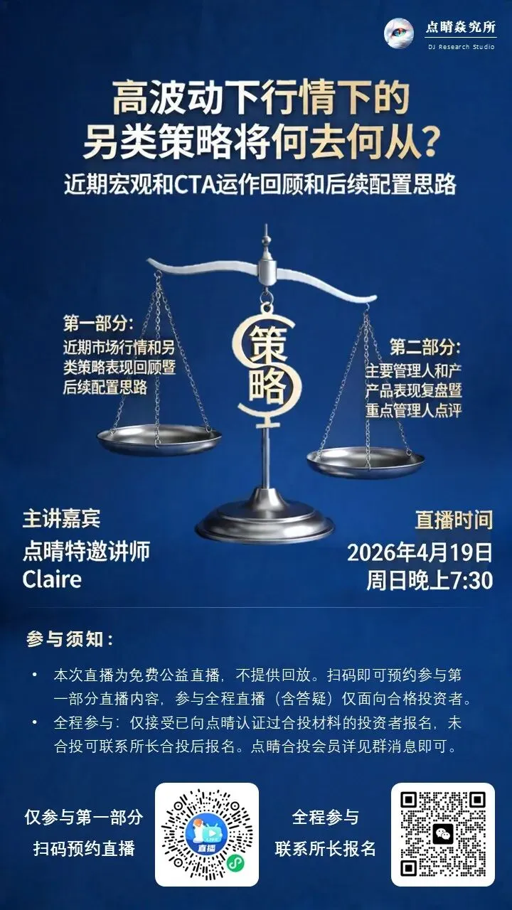 4月19日,本周日晚上七点半,点睛将为大家带来公益福利复盘直播课程。回顾在过去刚经历的高波动市场下,另类策略的表现,以及接下来的配置思路。主要内容包括: