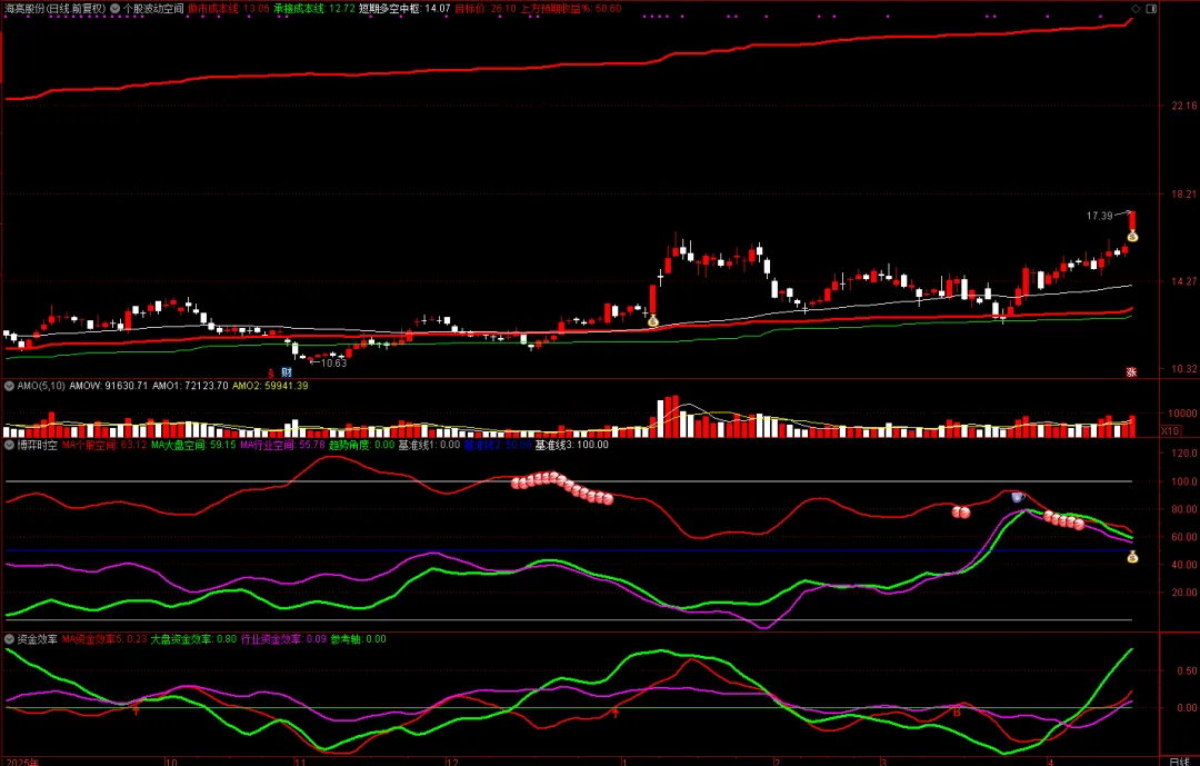 推演与预案:该股经历了“效率先转正→效率回落→价格回踩下轨→效率再度转正”的完整验证过程,下轨支撑有效性得到确认。后市若出现不利波动,回踩周五跳空缺口15.81元是重要观察位。多空平衡中枢线当前位于14.07元,正逐步上移对股价形成支撑。