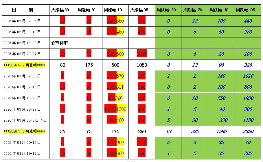 备注:本周是4月第2周,对比上周,对比平均,无论从上涨还是下跌来看,赚钱效应转好,尤其上涨30点以上个股大比例增加,数量为15。对比近期最大,天气转暖,舒适惬意!努力参与,提高认知! 寄语:拙,承载着本初的质朴,也闪烁着东方的智慧。股市里边的拙,往往表现为量的缩小、价格的下跌或收敛,趋势长期的横盘、资金的轻度套牢、心态的煎熬与焦灼等,古语云:大巧若拙、藏巧守拙,拙能生巧,总结2025年的操作,其实手中有操作过一大半以上的个股,如果能坚持守得住缩小的量,守得住价格下跌、收敛、横盘,守得住轻度的套牢、守得住心态的煎熬,往往都有30点-50点以上的收益,如此而言,这不就是一种投资的智慧吗?新年,更需要减少浮躁,减少操作,增加定力,增加信念,要“敢于守拙”,须知“财从拙中来”。