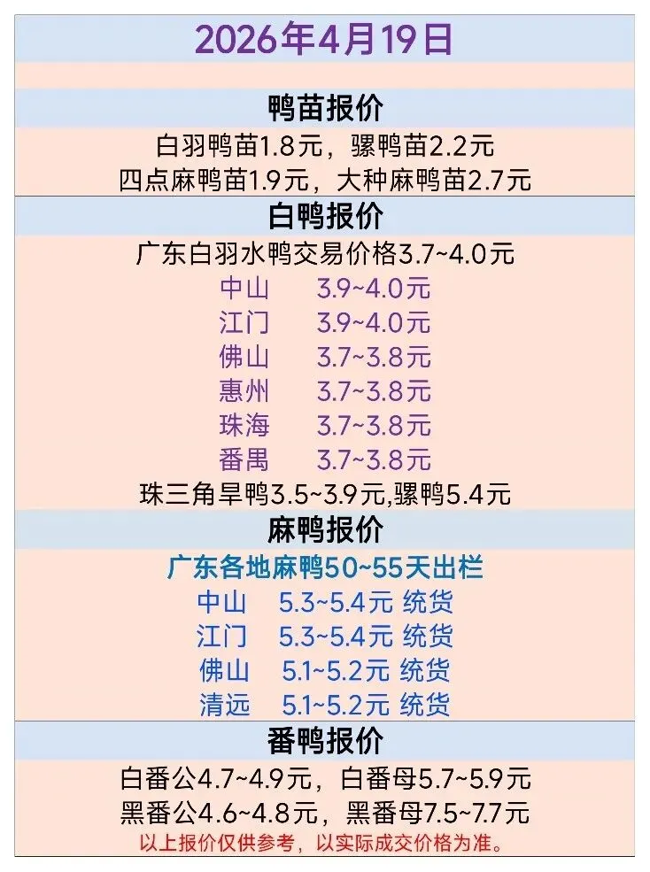 四点麻鸭苗价格稳定,报1.9元;大种麻鸭苗价格稳定,报2.7元。广东大种白番公苗报1.6~1.9元, 大种白番母苗报3.6~4.1元;广东大花黑番公苗报4.1~4.6元, 大花黑番母苗报3.6~4.1元。