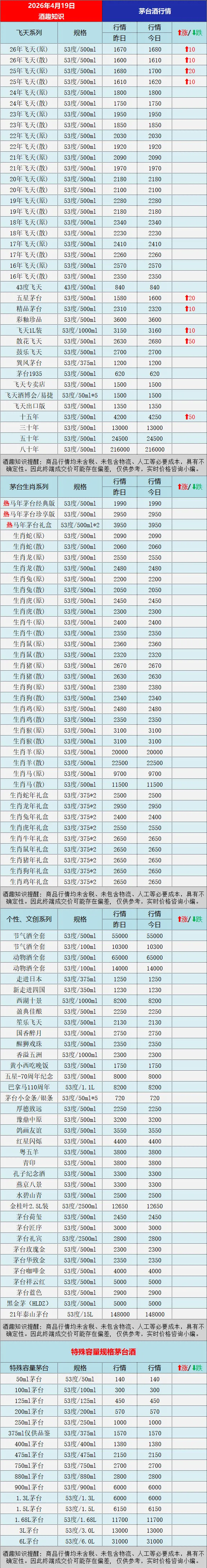 今日茅台酒行情价格参考:飞天系列,2025-2026年飞天原箱、散瓶持续多日上涨,精品茅台、五星茅台、公斤茅台、散花飞天、茅台十五年等集体上涨。更多茅台系列酒具体行情参考下文图表:《酒趣知识》温馨提醒:商品信息均未含税、未包含物流、人工等必要成本,具有不确定性。因此终端成交价可能存在偏差, 仅供参考,实时价格咨询小编。注意:茅台等品牌老酒价格小幅波动频繁,老酒受品相克重影响价格差异大,同时不同地区价格有几十元不等的差价,最终以实际成交价格为准!《酒趣知识》多媒体平台同步给您带来茅台酒及时行情参考,同步深挖茅台、五粮液、汾酒等各大名酒资讯,为酒友奉上客观的价格参考与专业的行业解读,让大家用酒有价可依、避坑无忧。丨声明:部分图文来源于网络,版权归原作者所有,如涉及版权等问题,请及时与小编联系删除或修改。