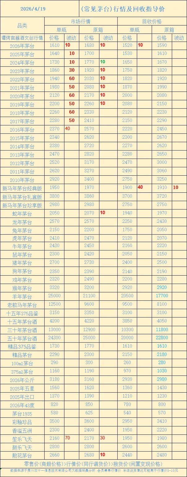 今天是2026年4月19日星期日,与昨日行情相比:常规茅台中:2026年飞天原箱6瓶装、2026年飞天散瓶、2025年飞天散瓶、2024年飞天散瓶、2023年飞天原箱、2023年飞天散瓶、2022年飞天原箱、2022年飞天散瓶、2021年飞天原箱、2021年飞天散瓶、2020年飞天原箱、2020年飞天散瓶、2019年飞天原箱、2019年飞天散瓶、2018年飞天散瓶、2017年飞天散瓶、2016年飞天散瓶、2015年飞天散瓶,2014年飞天散瓶,2013年飞天散瓶上涨;2024年飞天原箱6瓶装下跌。生肖茅台中:蛇年生肖原箱上涨。文创个性化中:散花飞天、笙乐飞天上涨。回收参考价常规茅台中:2026年散瓶飞天上涨,生肖茅台中:经典马单瓶和原箱涨价。