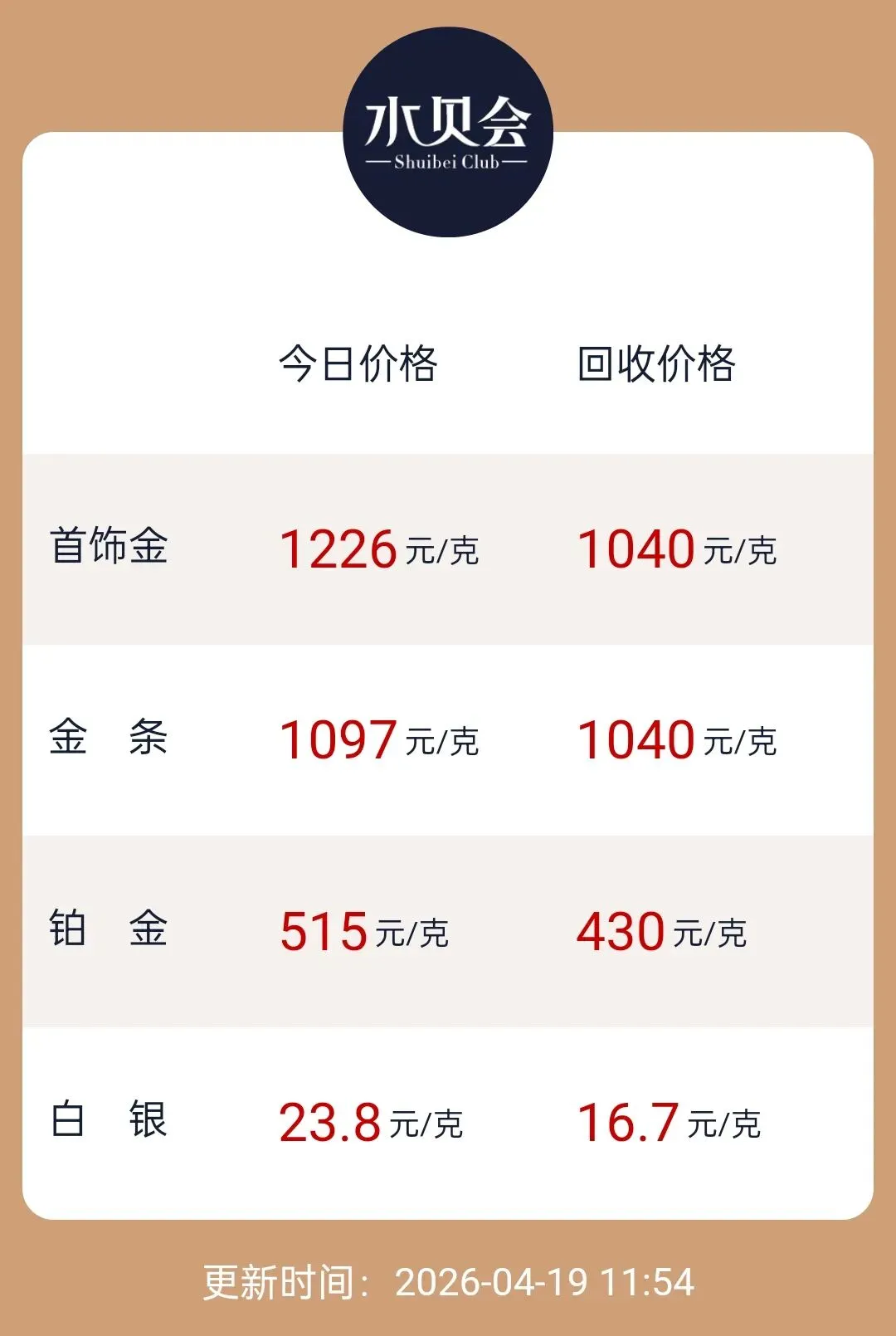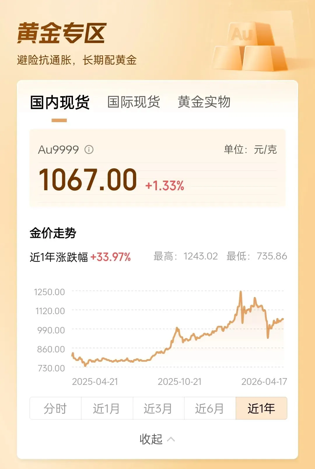 今日金价行情(2026年4月19日11时54分)黄金AU9999 报1067元/克
