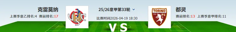 克雷莫纳本赛季的表现也是符合升班马的身份,其实球队在整个上半程的表现非常不错,但是在最近的18场比赛中只赢了一场比赛,输了13场,导致球队目前仅仅压意煲级线经有友力部容保级晟级机命已是无欲无求,完全没有必要为难对手,且都灵的客场表现拉胯,支持保级诉求强烈的克雷莫纳捍卫主场。方向:让胜