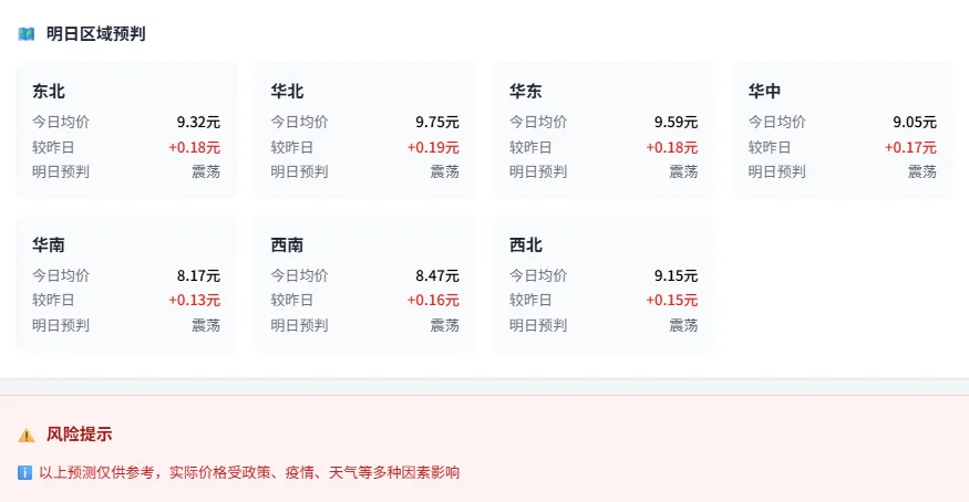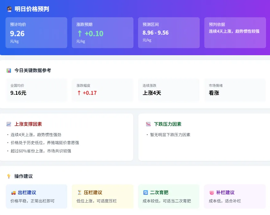 🔗 产销价差分析:猪肉(16.37) - 生猪(9.16) = 7.21元(价差率78.7%)。价差率较高,屠宰利润丰厚,但终端消费承压,需警惕价格回调风险。