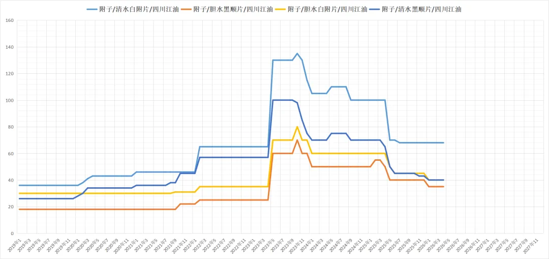 产地货源供应稳定,近期商家购货力度不大,多以实际需求为导向,价格暂无明显变动,现黑顺片统货(过6号筛)44元,大片价格在50元左右。