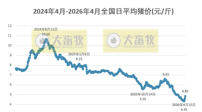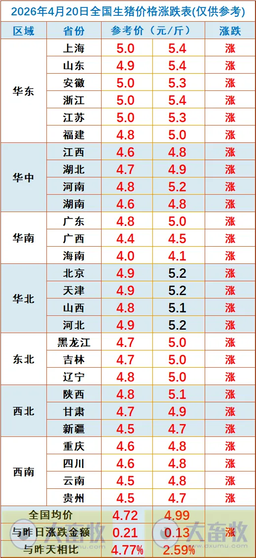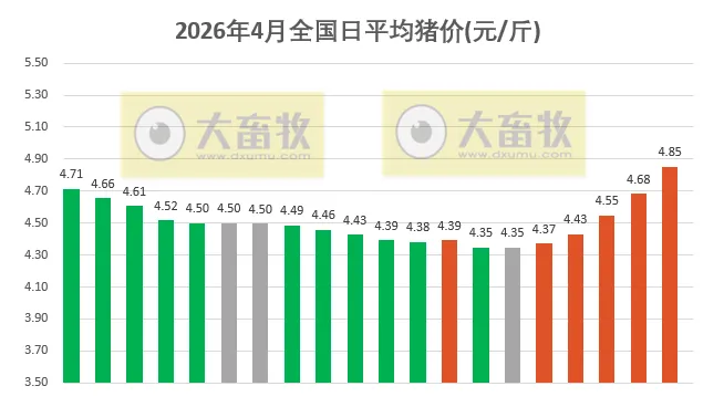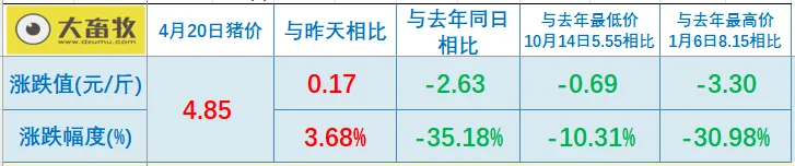 大畜牧小编根据我国27省的猪价数据,计算出2026年4月20日全国平均猪价为每斤4.85元,比昨天上涨0.17元,涨幅为3.68%,继续大幅上涨,连续5天上涨,累计上涨0.50元,不仅是4月以来最高价,也是近28天最高价;