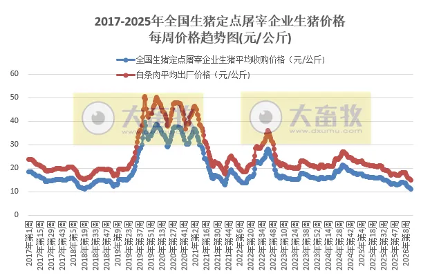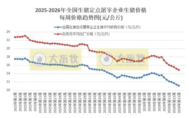 据农业农村部监测,2026年4月6—12日,生猪定点屠宰企业生猪平均收购价格为11.12元/公斤,环比下降2.5%,连续7周环比下降,至少是近10年最低价,同比下降31.1%。