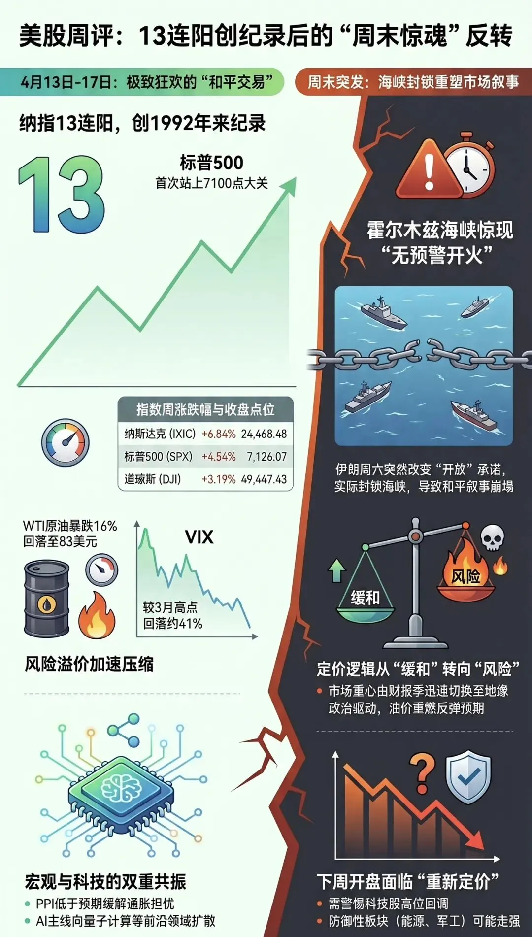 周五(4月17日):霍尔木兹“全面开放”——情绪冲顶时刻。道指+1.79%,标普+1.20%(首次站上7100),纳指+1.52%(十三连涨)。伊朗宣布“完全开放霍尔木兹海峡”,成为决定性变量。油价暴跌(WTI -11.45%),市场迅速定价:能源冲击解除、通胀回落;风险资产全面爆发:非必需消费(邮轮、航空)领涨、科技与AI链条继续扩张、VIX持续回落。市场甚至出现“FOMO交易”(害怕错过和平),资金在周末前加速入场。这一刻,市场几乎完成了对“冲突结束”的定价。