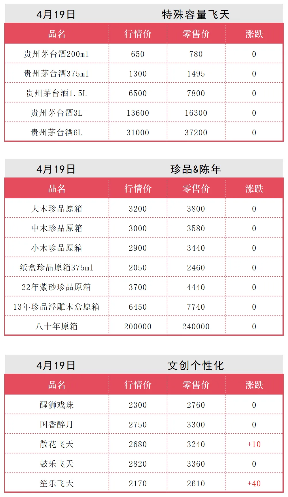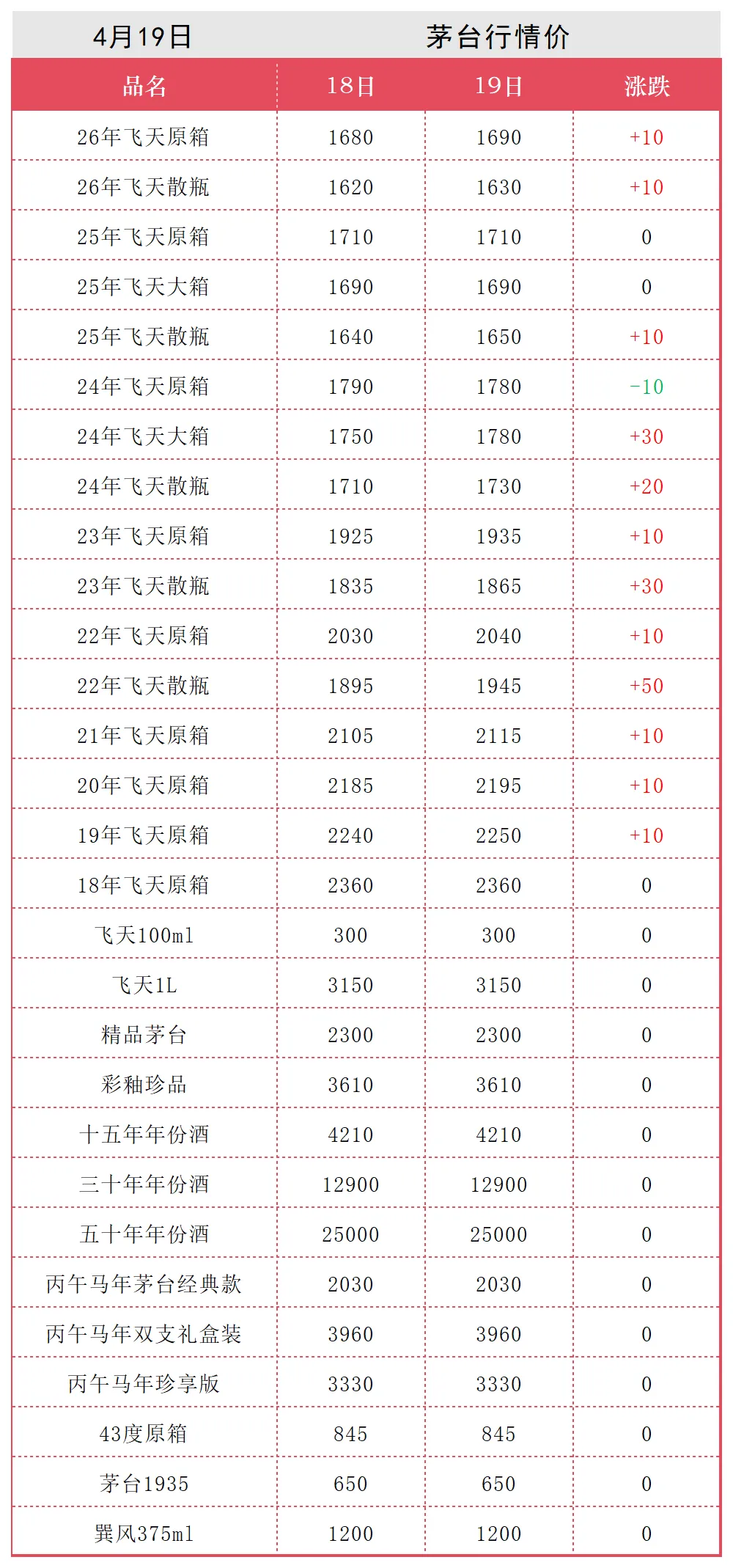 4月19日更新,茅台行情及一线回收参考价格汇总