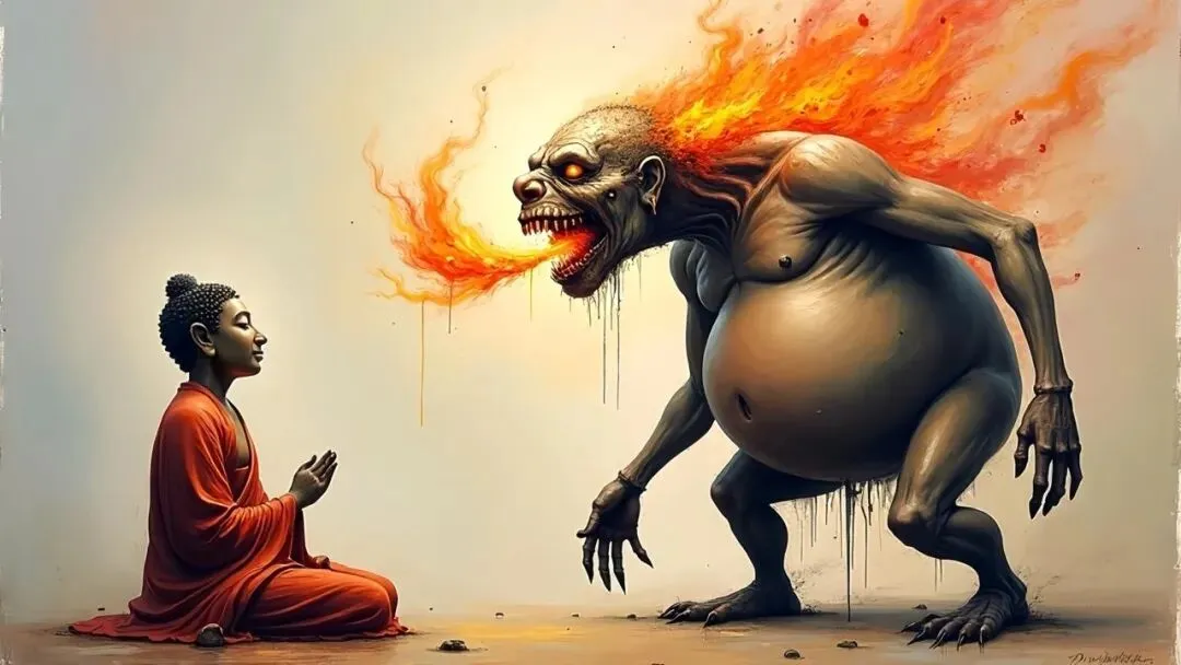 佛法里描述的饿鬼道众生,有着极具警示意义的外形:肚子膨胀如山,容量无边无际,永远填不满饥渴;咽喉却细如针孔,哪怕一丝一毫的食物,都难以吞咽。