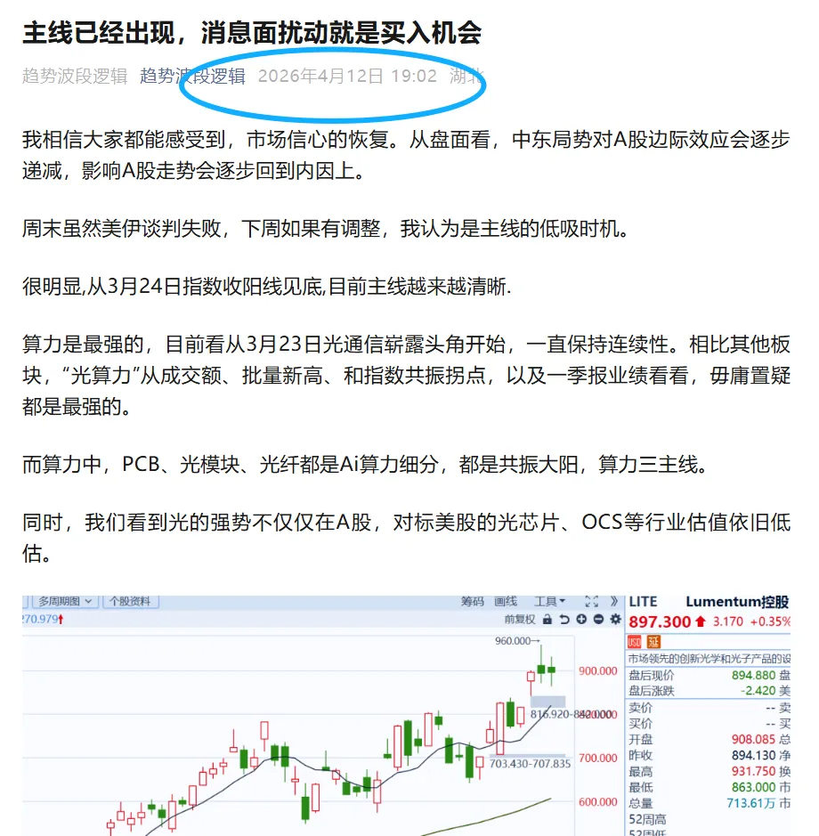 果然,周一(4月13日)指数震荡,光通信核心股下跌,都给了好买点。从周二开始逐步迎来主升浪。
