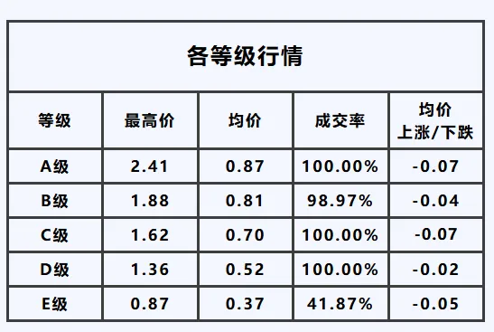 A级——最高价2.41元/枝,均价较昨日,下跌0.07元/枝;