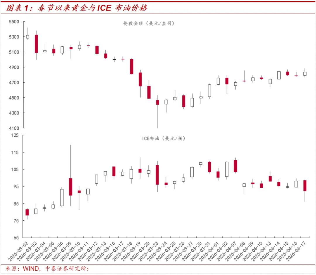 美伊冲突缓和是推动本周市场上涨的核心因素。4月15日美国方面消息称,调解方正接近就延长美国与伊朗之间的停火达成一致,并推动重启谈判。消息人士称,美伊双方已“原则上同意”延长将于4月22日到期的临时停火协议,以争取更多外交时间。此前,包括美国总统特朗普和联合国秘书长古特雷斯在内的多方表示,未来几天有望重启谈判。从大类资产来看,本周全球流动性有所修复,本周国际原油价格震荡下跌,贵金属价格回暖。地缘风险降温显著改善全球市场风险偏好,外资风险偏好回升带动A股情绪修复。