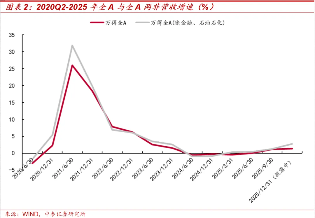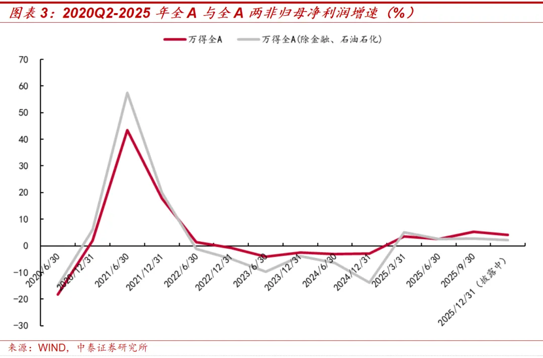 进一步剔除非经常性损益后,核心利润指标同样表现亮眼。2025年全A扣非归母净利润同比增长2.20%,较去年同期的-14%显著改善,增速由负转正且大幅回升,为2022年以来最高水平。核心利润的修复更为真实地反映了上市公司主营业务盈利能力的改善情况,也表明此轮业绩修复具有较强的内生性,而非单纯依赖非经常性损益粉饰。从修复节奏来看,2025年一季度与三季度为全年业绩增长的主要拉动阶段,这两个季度上市公司归母净利润增速相对领先,对全年业绩形成重要支撑。