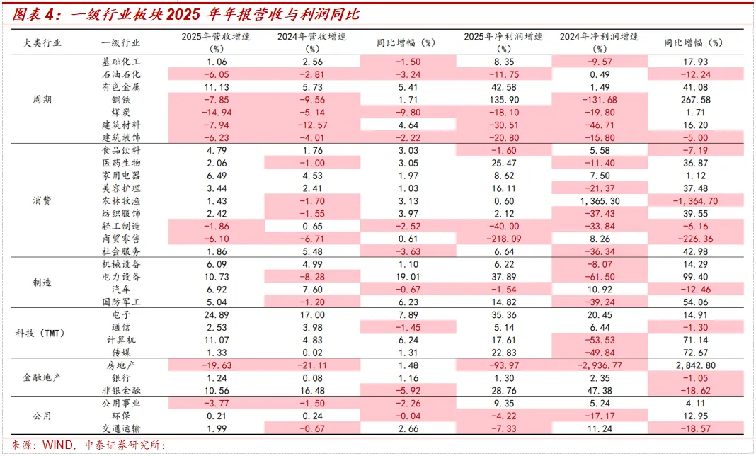 从已披露年报的板块分布来看,2025年科技、高端制造与医药板块业绩增速整体领先于其他板块,体现了产业升级与科技创新驱动下的结构性亮点。在科技成长赛道中,电子板块归母净利润同比增长35.36%,计算机板块增长17.61%,两大板块的高增主要受益于AI产业的持续蓬勃发展以及国家补贴政策带动消费电子需求回暖的双重提振。电力设备板块维持较高增速水平,2025年归母净利润同比增长37.89%,主要受益于新能源车渗透率持续提升以及配套设施建设的加快推进。周期板块在2025年呈现出明显的盈利修复特征,尤其是部分细分领域利润端增速显著领先于收入端。有色金属板块延续高增态势,同时受益于新能源产业与AI建设周期的双重拉动。
