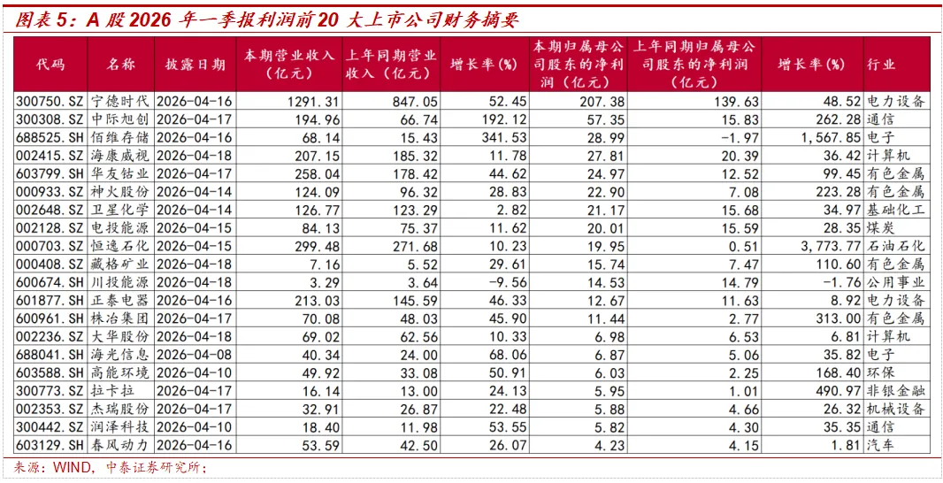 截至周五,共有156家上市公司披露一季报。其中披露的行业以化工,硬件设备和半导体,高端制造居多。整体来看,科技,电力设备行业一季度业绩表现亮眼。已披露的上市公司中,宁德时代归母净利润最高,达到207亿元人民币,同比增长48.52%。排名第二的是AI产业链龙头中际旭创,归母净利润高达57亿元,同比增长262%。除此之外,归母净利润前五的个股还有佰维存储,海康威视,华友钴业,大多都是新能源与芯片科技龙头,且归母净利润增速均处于较高水平。