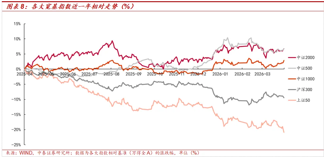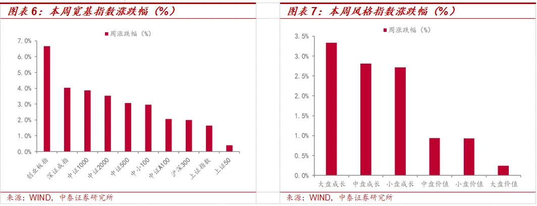 本周A股市场震荡上行,创业板指与北证50表现突出。本周上证指数上涨1.64%,创业板指大涨6.65%,北证50涨幅达7.43%;中小盘成长风格表现优于大盘蓝筹。从成交额来看,本周日均成交额2.36万亿元,环比增长10.27%,市场交投活跃度明显提升。