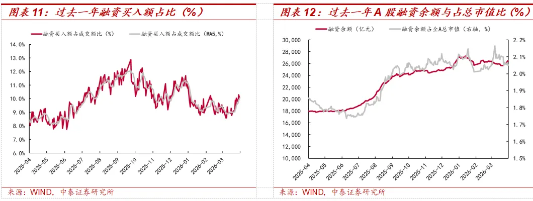 融资方面,本周融资买入占比上升。截至周四,融资余额达到2.65万亿元,约占全A总市值的2.05%,环比回升587亿元。过去5个交易日全A融资买入额大约占成交额的10.1%,环比上升0.79%。