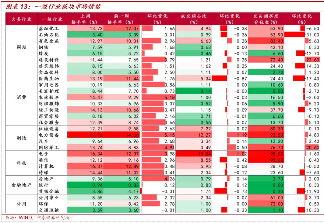 行业换手率普遍上涨,建筑材料、国防军工、有色金属板块拥挤度有所上升。行业方面,上周30个一级行业换手率有28个上涨,农林牧渔、电力设备、国防军工板块上涨幅度较大,分别上涨5.18%,5.15%,4.91%;石油石化、交通运输、非银金融板块下跌幅度较大,分别下跌0.01%,0.01%,0.31%。