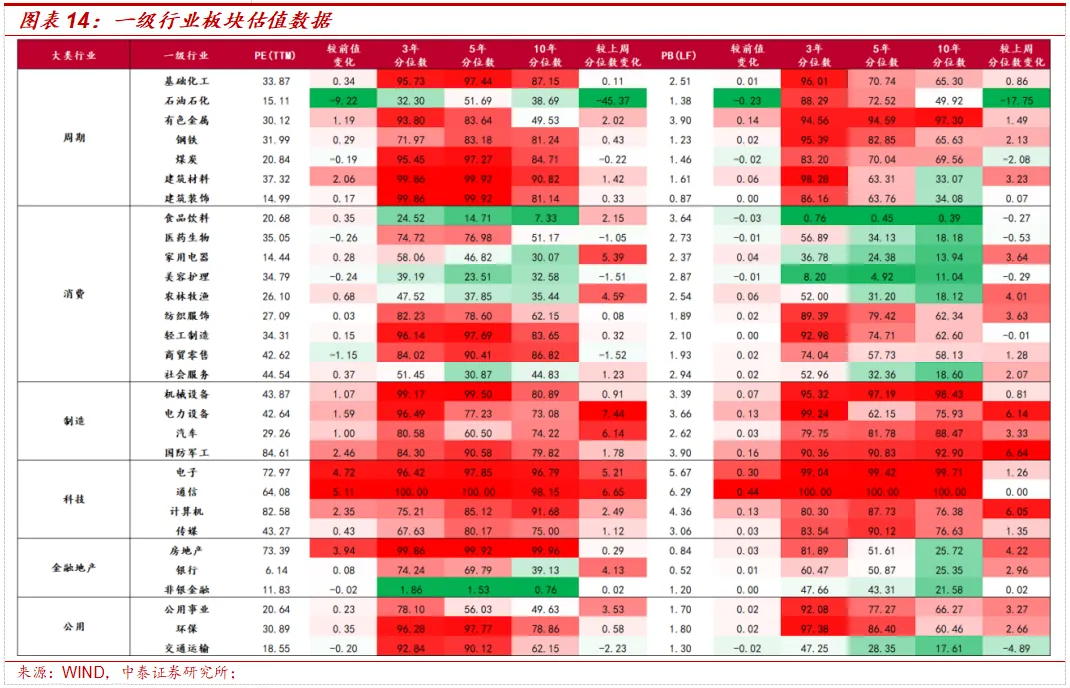 从相对位置来看,房地产、通信、电子板块当前市盈率处于历史极高位置(10年分位数均高于95%);家用电器、食品饮料、非银金融板块市盈率较低,10年分位数均低于30%,其中食品饮料和非银金融板块分位数低于10%。