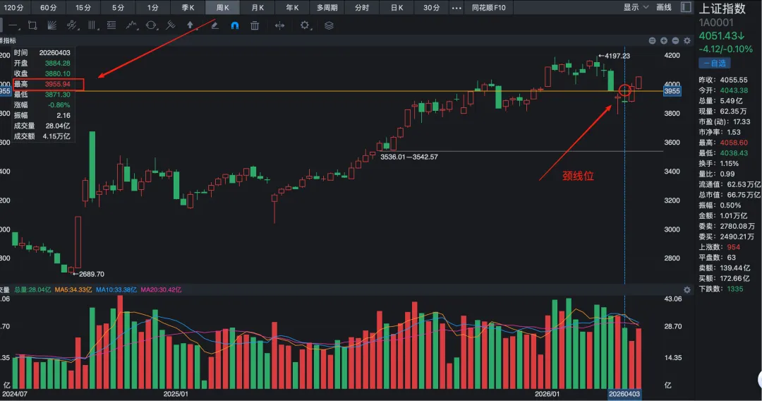 我们先看周线结构:4月3日那周高点3955.94,是小级别结构的颈线位。