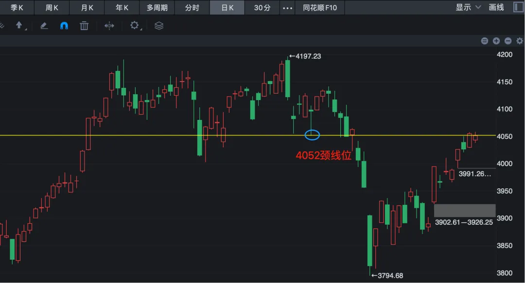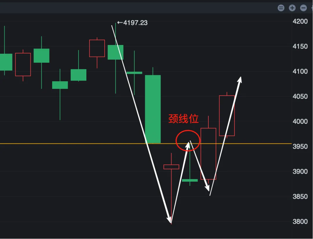 近两周连续收出两根阳线,形态上看似有所突破,但这里依旧存在回踩的可能——也就是回踩3955.94这一位置,测试颈线支撑是否有效。