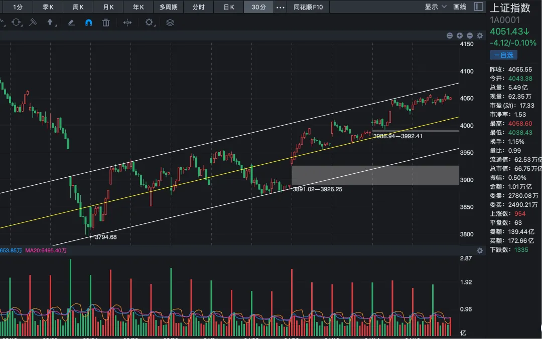 不过整体来看,我认为A股本轮上行趋势并没有结束,增量资金仍在持续进场,短期依旧具备继续上攻的动能,依然看好大盘回调之后再创出短期高点,4100还是可以期待的。