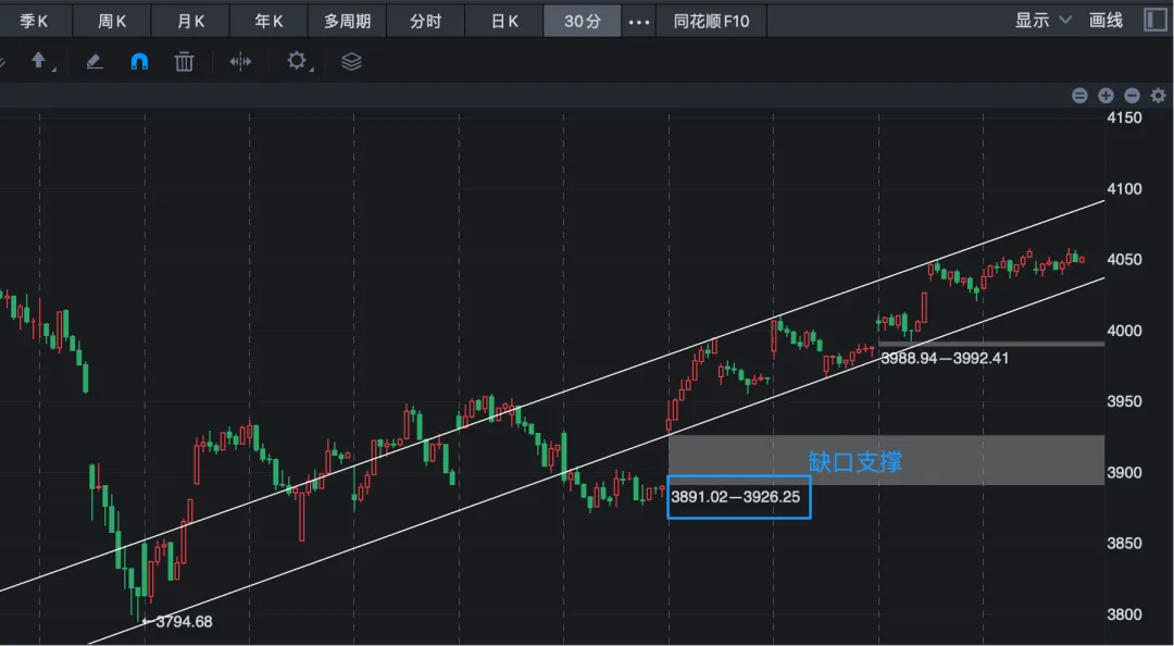 3891-3926这个跳空缺口已经存在一段时间,对本轮行情起到了明显的支撑作用。